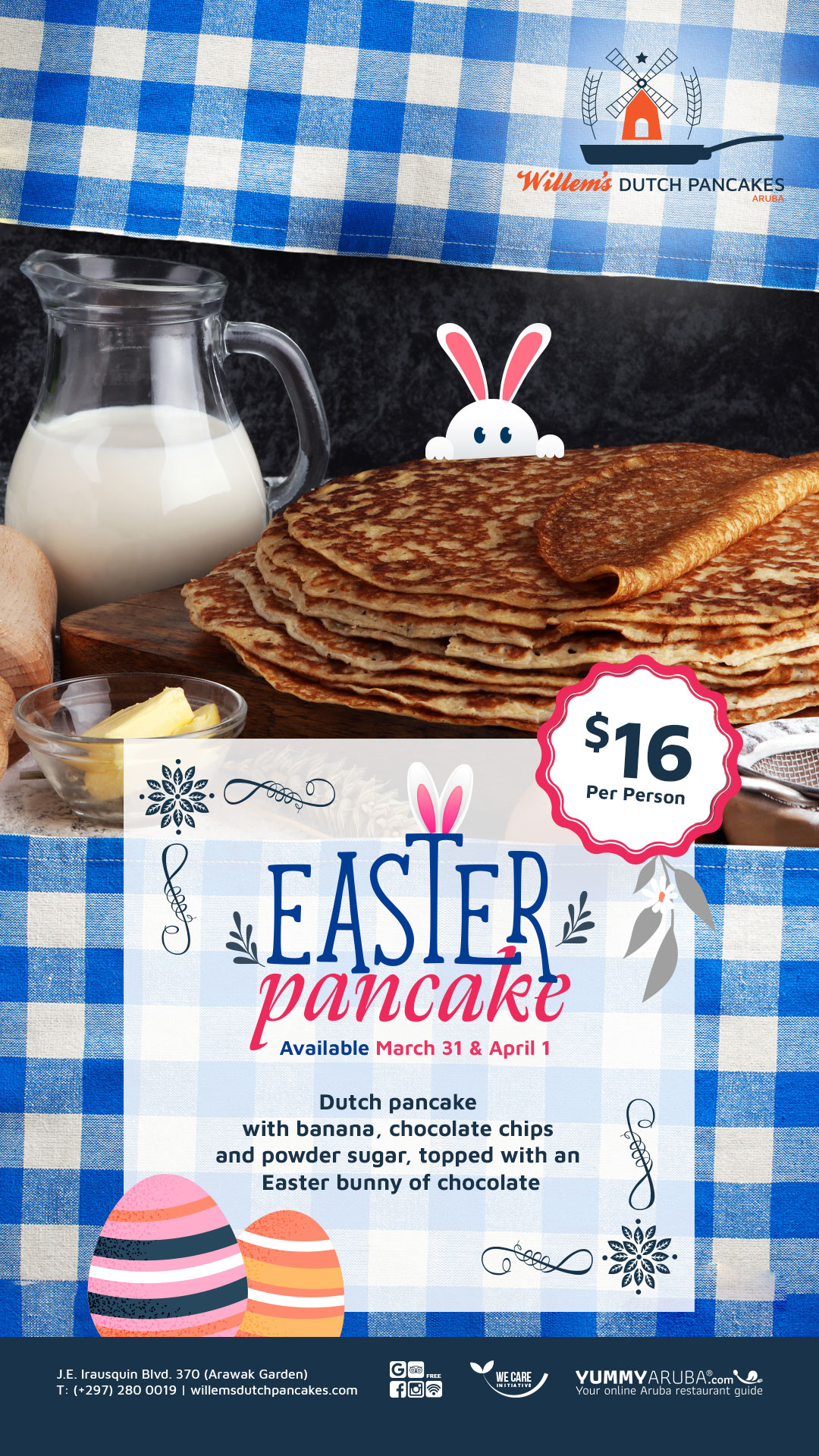 This Easter, treat yourself to a unique and delicious breakfast at Willems Dutch Pancakes. For just $16 on March 31st & April 1st, you can enjoy their special Easter pancake made with banana, chocolate chips, and powdered sugar.